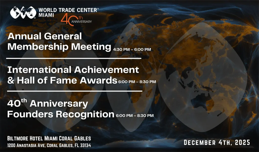 The World Trade Center Miami (WTCM) is South Florida’s premier international trade organization, serving as a catalyst for global commerce and economic expansion since 1971. Established by civic and business leaders committed to shaping Miami into an international business capital, WTCM has played a defining role in advancing the region’s position as the Gateway to the Americas.