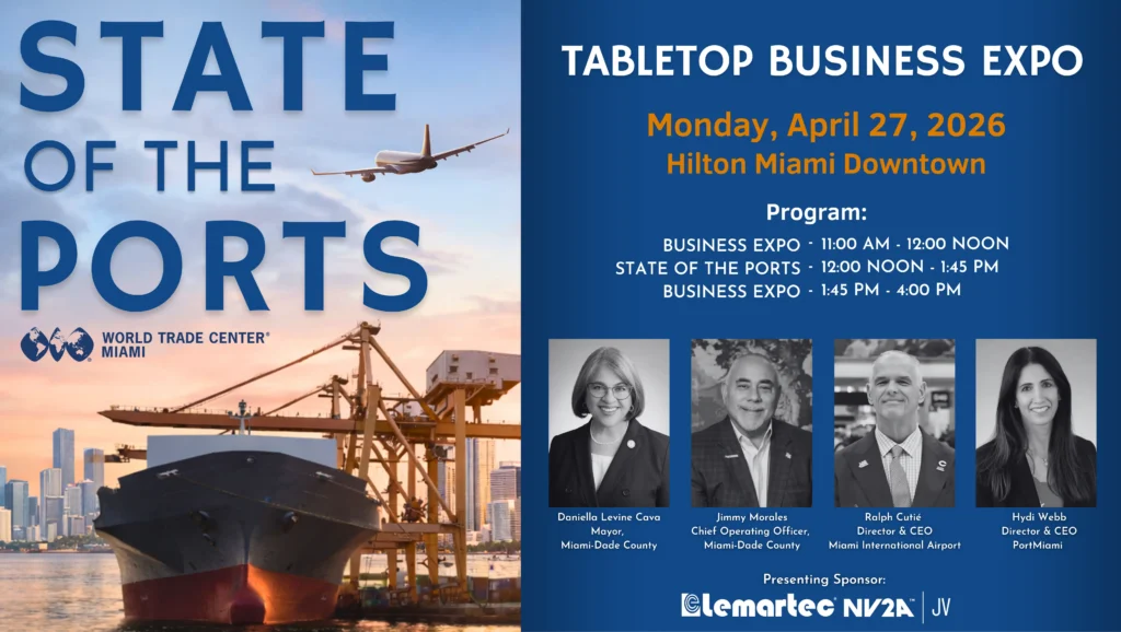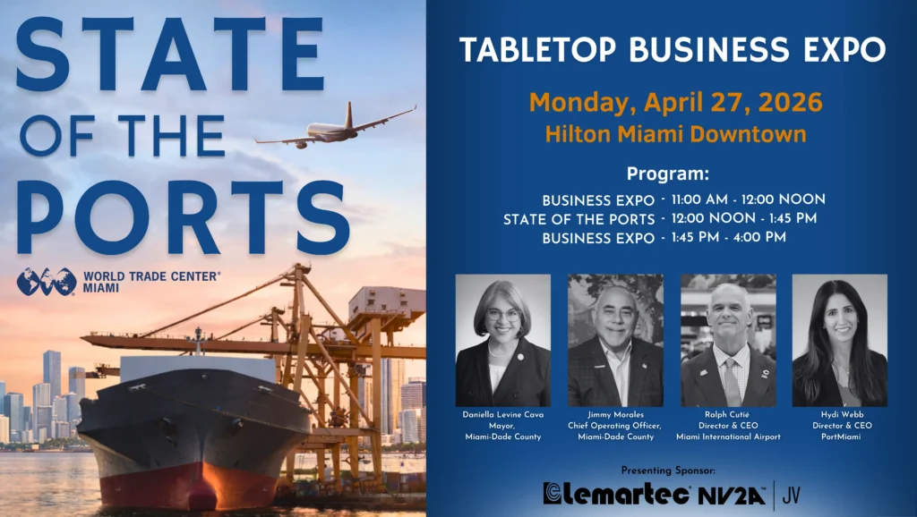 The World Trade Center Miami (WTCM) is South Florida’s premier international trade organization, serving as a catalyst for global commerce and economic expansion since 1971. Established by civic and business leaders committed to shaping Miami into an international business capital, WTCM has played a defining role in advancing the region’s position as the Gateway to the Americas.
