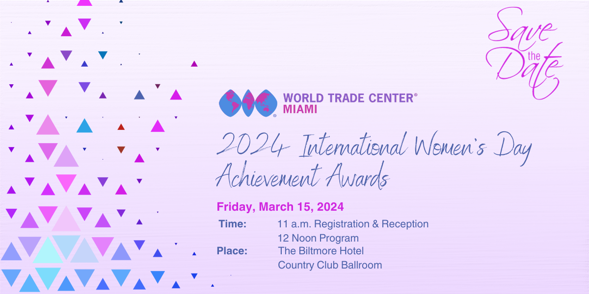 Join us on March 15, 2024, as the World Trade Center Miami, together with the South Florida international business community, commemorates the 21st Annual International Women’s Achievement Award. This ceremony is a tribute to the remarkable women who understand and advocate for the critical role of trade in our community and beyond.